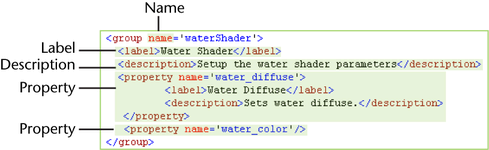 <group name='Brick_Shader'> <label>Brick Shading Properties</label> <description>Control main brick shader.<description> <property name='brick_diffuse'/> <property name='brick_color'/> <property name='brick_transparency'> </group>