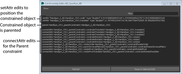 When you create a constraint on assembly reference nodes or assembly reference members, an add connection edit and parenting edit are applied to the objects. Depending on the type of constraint you create, more than one connection edit may be applied to the objects.