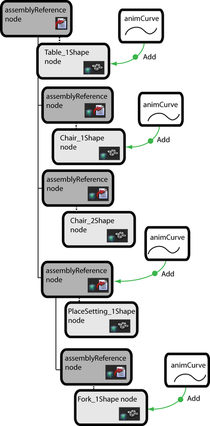 You can add animation curve data to assemblyReference nodes and nodes contained by Scene representations. These connections can be made to nodes at all levels of the assembly reference hierarchy. Edits that connect the animation curve to a node are stored and tracked by the highest-level assembly reference node. The animation curve data resides in the source file of the assemblyReference node or Scene representation.
