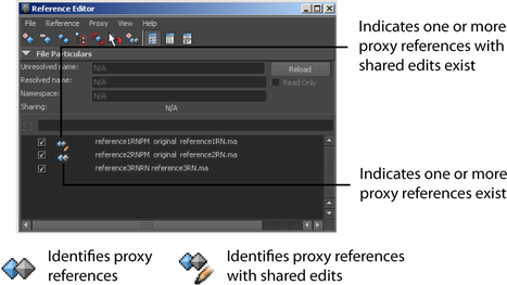 When a proxy set is created with shared edits, the original reference becomes a proxy reference within the new proxy set. In the Reference Editor, an icon is displayed to indicate the existence of one or more proxies for the reference, and to indicate that all proxies share a common set of edits.