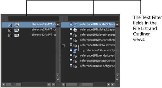 A Text Filter field appears in the File List and Outliner views in the Reference Editor. To filter the items that are displayed in each of these views, type text into the field.