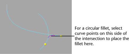 - Select curve points on each curve about where you want the fillet to begin and end. (The radius you enter for the fillet will determine the actual start and end points.)