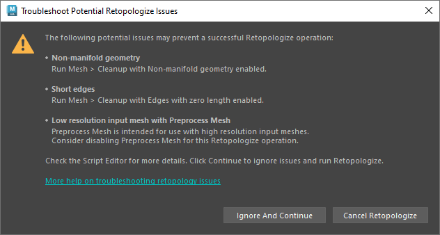Preprocess Mesh is turned on and a warning appears in the Troubleshoot Potential Retopologize Issues dialog box |