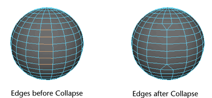 Tip: This command also works on faces, but it produces unpredictable results. If you want to collapse and merge a selection of faces, try using Edit Mesh > Merge to Center.