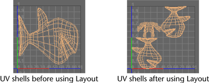 Layout feature automatically repositions UV shells so they don’t overlap in UV texture space and maximizes the spacing and fit between them. This is useful for ensuring that the UV shells occupy their own separate UV texture space. For example, if you are applying Fur to a surface, the UV texture coordinates on a given shell must not overlap.