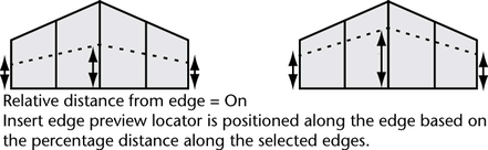 When the Maintain position is set to Relative distance from edge (default) the dotted insert edge preview locator is positioned along the selected edge based on a percentage distance along the selected edge. For example, if you click and then drag the selected edge to a location that is approximately halfway along the selected edge, the dotted preview locator appears approximately halfway between all of the other edges along the selected edge ring.