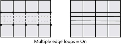 Inserts multiple equally spaced edge loops along the selected edges, based on the number specified in the Number of loops setting. The multiple edge loops cannot be manually repositioned. The maintain distance settings are not available when Multiple edge loops is turned on.