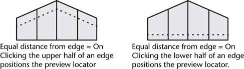 When Maintain position is set to Equal distance from edge, the dotted insert edge preview locator is positioned along the selected edges at an absolute distance based on where you click on the first edge. When the length of edges is highly variable, the tool uses the shortest edge to determine the maximum distance the preview locator can be moved. This option is useful if you want the new edges inserted at a specific distance from existing edges. For example, when you want to control any subsequent edge creasing you may perform on the mesh.