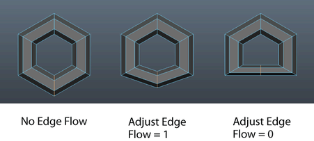 Set Adjust Edge Flow to 1 to transform the surface curvature of the edges to respect the curvature of the surrounding mesh. At 0 the edges move to the middle of the other nearby edges, creating a flat surface.