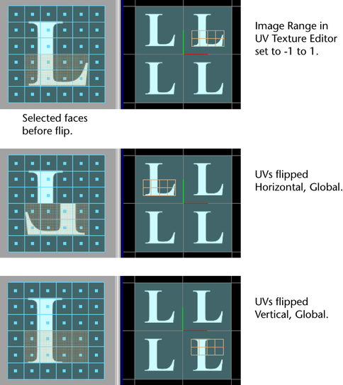 Set Global as required to flip the UV shells in global UV space in the 0 to 1 texture space axis. Select Local to flip the UVs within the bounding box of the selected shells. The default is Local.