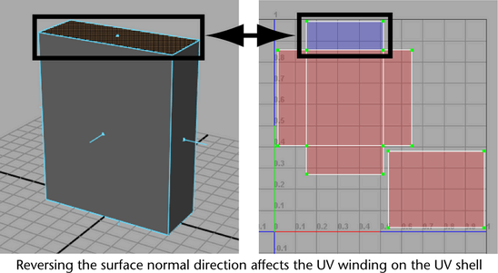 Any UV shells that display with incorrect UV winding can be modified using the Flip UVs feature. For more information see Flip or rotate UV shells.