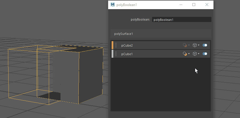 The result object of the boolean operation is named polySurface#. This name is displayed in the Boolean stack and the Outliner. |