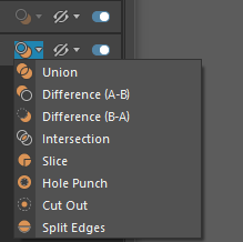 Change the boolean operation for the selected layer. The master layer is not associated with any operation and it's boolean operation cannot be changed. You can change the boolean operation for any layer below the master layer. For more information on each operation, see Boolean operations.