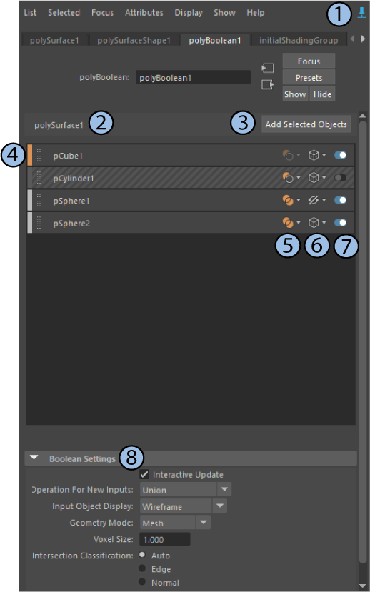 Keeps the selected tab visible in the Attribute Editor, even when you change selection in your scene. See Work with the Boolean stack. |