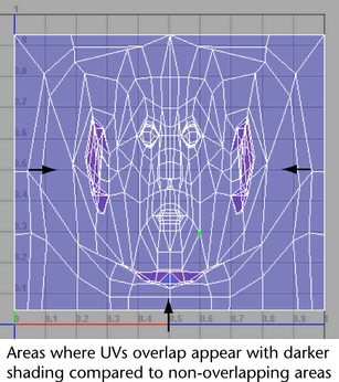 UV Editor. When activated, all selected UV shells appear shaded in a semitransparent way. However, areas that appear more opaque than normal indicate regions of overlap. Overlapping UVs are often undesirable because any associated texture maps will also overlap on the related surface meshes.