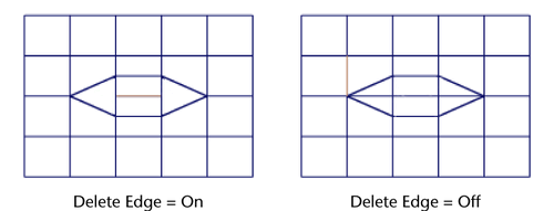 When offsetting edges on a partial interior edge loop the new polygons that get created at either end of the loop can be three-sided. When Delete edge is turned on the start and end edges of the loop are deleted to maintain a four-sided topology on the mesh. The Delete edge option is not available when the Tool Completion - Automatically option is turned on.