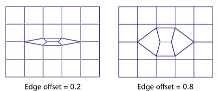 Edge offset is only available when Offset Edge Loop is set to work as an action. This option determines the distance the offset edges will be positioned on either adjacent side of the selected edge. The Edge offset units are based on a percentage of the distance between the selected edge and the adjacent edges on either side. For example, setting the Edge offset to 0.5 (default) positions the offset edges halfway between the selected edge and the original adjacent opposite edges.