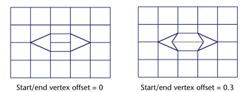 Determines the distance that the two vertices on either end of the selected edge (or a series of connected edges in an edge loop) will be offset inwards or outwards from their original position on the selected edge. The default Offset is 0. The Start/end vertex offset units are based on a percentage of the length of the selected edge.