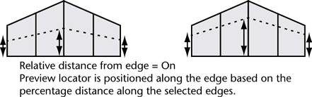 When the Maintain position is set to Relative distance from edge (default) the dotted preview locator is positioned along the selected edge based on a percentage distance along the selected edge. For example, if you click and then drag the selected edge to a location that is approximately halfway along the selected edge, the dotted preview locator appears approximately halfway between all of the other edges along the selected edge ring.