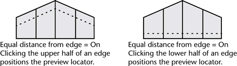 When Maintain position is set to Equal distance from edge, the dotted preview locator is positioned along the selected edges at an absolute distance based on where you click on the first edge. When the length of edges is highly variable, the tool uses the shortest edge to determine the maximum distance the preview locator can be moved. This option is useful if you want the new edges inserted at a specific distance from existing edges. For example, when you want to control any subsequent edge creasing you may perform on the mesh.