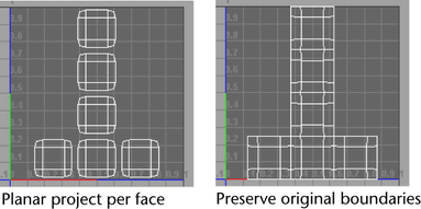Each original face is projected using a planar projection to produce UVs that incorporate the new faces resulting from the bevel. The boundaries of the original UV coordinates may be modified as a result.