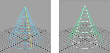 In the following figure, a V isoparm is selected, moved, then detached twice. The first detachment moves the seam of the cone, which is periodic in V.
