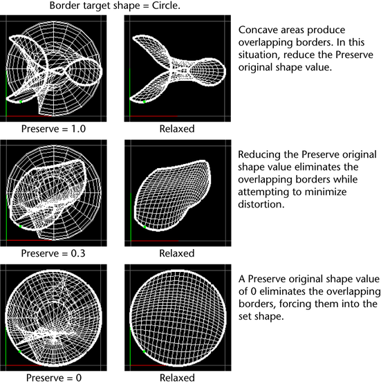 Determines how closely the border mapping will match the selected Border Target Shape. Use the slider or enter a value between 0 and 1 to control the blend of the existing UV border with the specified Border Target Shape. A value of 0 produces a UV border mapping that is closest to the specified target shape (Square or Circle). A value of 1 produces a border that closely represents the world-space relationships between edges, but can result in concave areas along the border—these will produce overlapping interior UVs once relaxed.