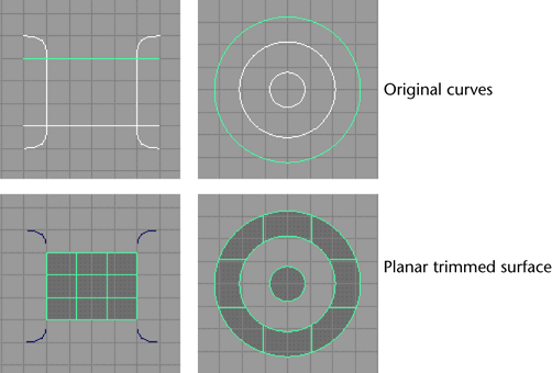The Planar action creates a flat, trimmed NURBS surface inside a curve.