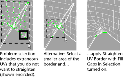 The Fill gaps in selection options helps you straighten UVs that are missing from your selection because they are difficult to select.