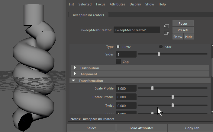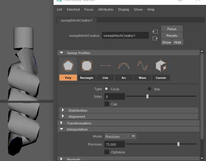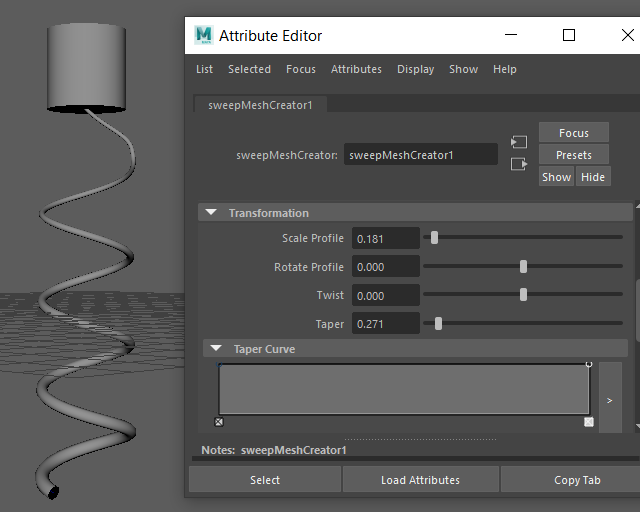 main Maya Menu. The curve adopts the default Sweep shape, which is a somewhat rough around the edges.