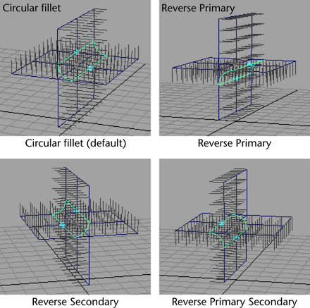 You can also reverse surface normals by selecting points on the surfaces and constructing the fillet. For example, the normals on the secondary surface are reversed if the point selected on the primary surface does not lie on the same side as its surface normal.