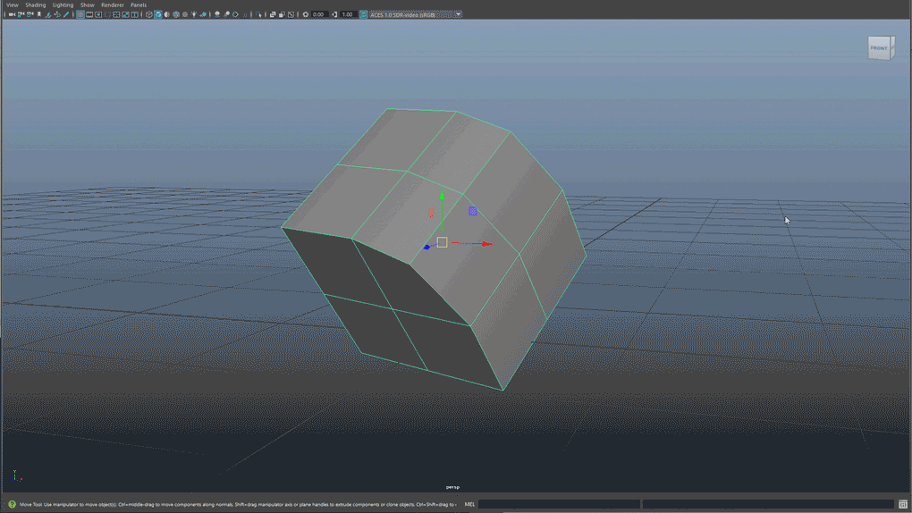 To activate Smart Extrude, first make a component selection of faces in the viewport. Then, select Edit Mesh > Smart Extrude and use the manipulator to drag faces in the Viewport. Any overlapping faces are automatically stitched and rebuilt into the mesh for clean topology results.