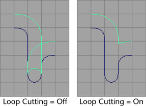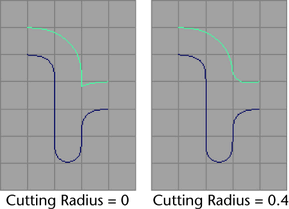 When Loop Cutting is on, the Cutting Radius value is used. If the Cutting Radius value is greater than 0, instead of getting a sharp corner at the point where the loop has been cut, you get an arc of the specified radius.