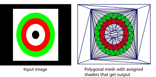 You can convert a texture image into a polygon mesh using Modify > Convert > Texture to Geometry. Texture to Geometry converts an image into geometry by creating a polygonal mesh that is subdivided based on the colors in the image. The subdivided faces on the mesh may then be assigned a shading material with a similar color to the original image. The subdivided polygonal mesh can be used as is or, if the image was mapped onto geometry it can be made to wrap around the original polygon mesh so that it appears in the same location as the original texture map.