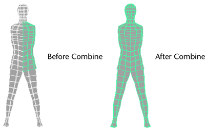 In general, you must combine separate polygon meshes before you can perform many types of polygon editing operations. For example, if you wanted to merge the edges/vertices of two halves of a character, you must first Combine the meshes into one object.