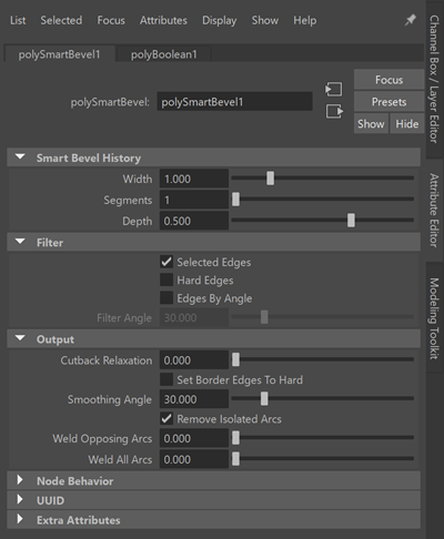 Smart Bevel's options are very similar to those of Maya's traditional Bevel method, with a few notable differences.