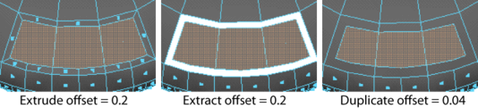 - Enter a value to offset the edges of the extracted faces. Offsets for extruding and duplicating faces are also shown here for comparison. This option can be used to produce a bevel effect for extrusions, cut-outs around faces using