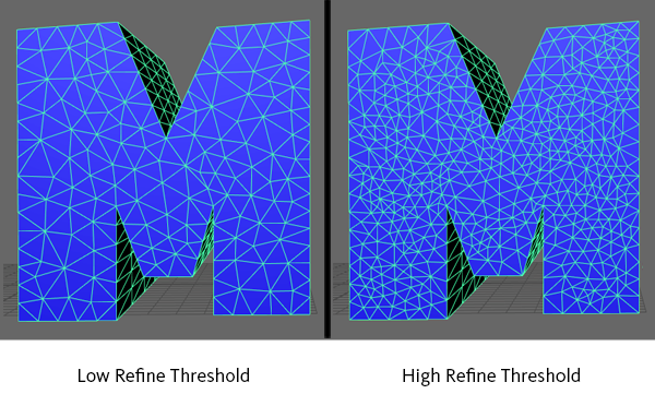 This works by first subdividing the Type mesh along its edges (controlled via a combination of Max Edge Divisions and Max Edge Length attributes) then executing a polyRemesh operation on it. After that, the Reduce Threshold and Refine Threshold determine the layout of the subdivided caps.