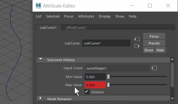Max Value and set another key. Scrub the Time Slider to ensure the offset curve length changes from 0 to 1.
