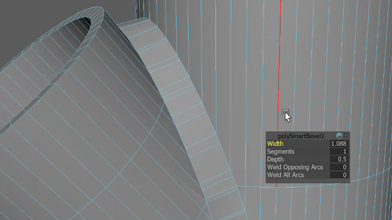 Width controls the extent of the Smart Bevel along the selected edges. This option functions in world units, not as a percentage of edge length. This ensures consistent application regardless of edge length.