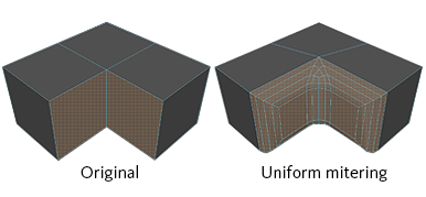 The mitering vertex moves along only hard edges. If there is more than one hard edge connected, an average of those edges will be used instead. If no hard edges are present, the result is identical to Center.