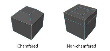 Creates a single vertex, regardless of how many edges at the intersection are not part of the bevel operation. If there are at least two edges at the bevel intersection that aren't being beveled, Maya creates a corner. When beveling two edges that share only one non-beveled edge at the intersection, no corner polygons are created.