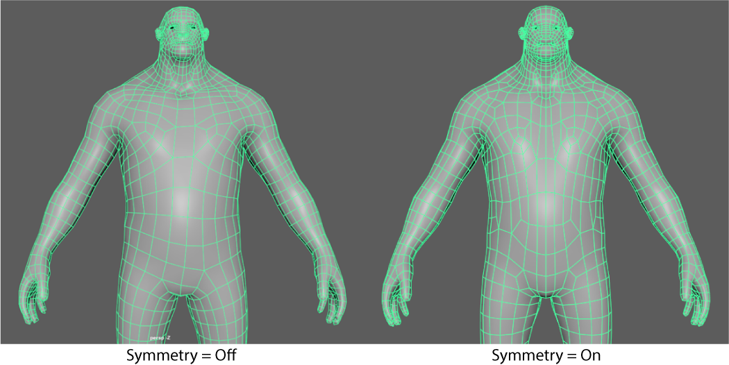 The following example shows a mesh that has been retopologized with and without symmetry enabled. When symmetry is turned off, the resulting shape appears symmetrical even though the topology is not. With symmetry turned on,