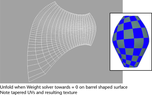 A barrel shaped polygonal object is texture-mapped with a checker texture. Performing an initial unfold operation with the