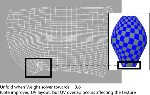 option set to 0.6. This unfolds the UVs in a more global manner and reduces the tapering that previously occurred. The UV layout is more predictable, but there is some overlap of UVs in the lower left corner of the UV mesh resulting in overlap on the texture.