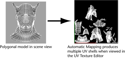 Automatic mapping creates several UV map pieces or shells in texture space. This is fine if you are using tools that deal with UVs automatically for you, such as standard (not combed) fur and the 3D Paint tool in projection mode. If you need to work with the UVs manually, you will need to stitch the UV shells back together in the UV Editor using the Move and Sew UV Edges feature.