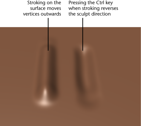 The vertices on the mesh(es) move slightly outwards along the path you dragged. This path is called a stroke. A stroke appears continuous but is actually made up of many stamp impressions that overlap each other. You can adjust how much the stamps overlap by adjusting the Spacing setting.