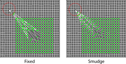 Drags or smudges UVs in the direction of the UV Smudge Tool brush’s movements.