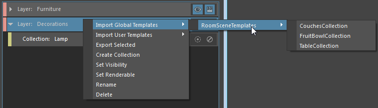 To import a collection, you must navigate to a render layer and right-click to select the template file that you want to import. Only template files of a compatible type are listed. Therefore, if you right-click on a render layer, only template files that contain collections are listed. Template files that contain an override, for example, are not listed.