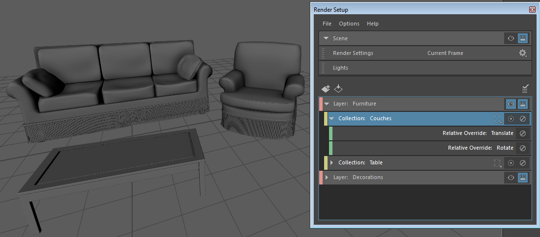 Select Couches to export the Couches collection, and its translate and rotate overrides are included with the exported template. You can also export only an individual override; for example, translate.